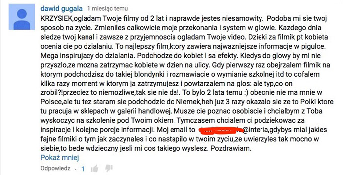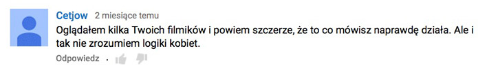 Krzysiek jesteś praktykiem jak mało kto i naprawdę dobrze pokazujesz jak radzić sobie z kobietami. Byłem totalnie w szoku kiedy obejrzałem to nagranie z randki. Nigdy bym nie przypuszczał, że tego typu teksty i słowa mogą tak mocno zadziałać na dziewczynę :) To naprawdę działa!
