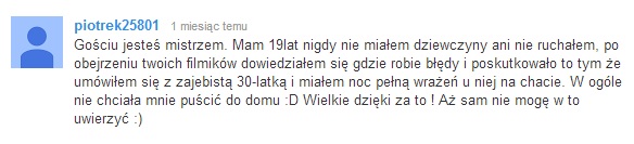 Chciałem Cię pochwalić tym mailem bo naprawdę nie spodziewałem się tak dobrego materiału :) Od zawsze Cie cenię za to co robisz i szanuję ale w tym materiale pokazałeś naprawdę wiele - cały proces uwodzenia kobiety. W tym miejscu chciałem Cię trochę opieprzyć : Dzięki temu materiałowi naprawdę poprawiłem moje randki z kobietami i rozmowy ale dlaczego nagrałeś to dopiero teraz? Gdybym wcześniej wiedział to czego mnie nauczyłeś teraz to na pewno miałbym dużo bardziej udane kontakty z dziewczynami. Nie będę narzekał :) Materiał Zajebisty szczególnie podoba mi się to jak pokazujesz randkę z dziewczyną i to w jaki sposób prowadzić znajomość z dziewczyną aby ją uwieść